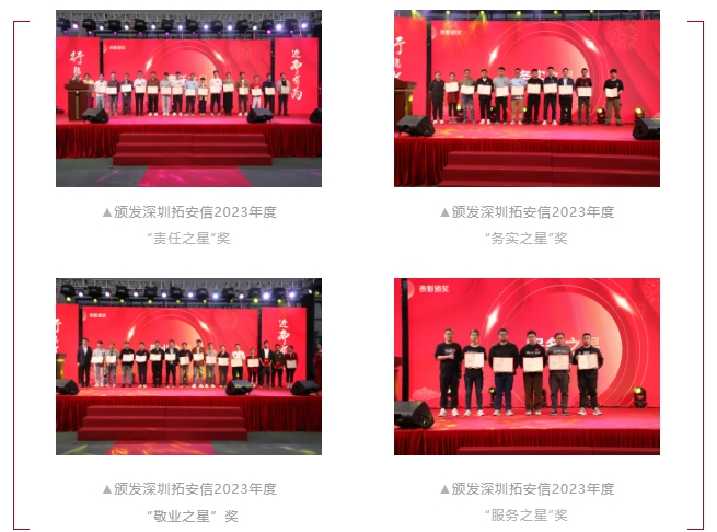 2024年1月13日,“行稳致远,进而有为”深圳拓安信2024年会盛典在东莞安信物联网产业中心盛大举行。这是2020年以来公司举行的首次年会,也是公司总部各中心、事业部与全国各办事处的同事们齐聚东莞产业园的第一次大联欢!